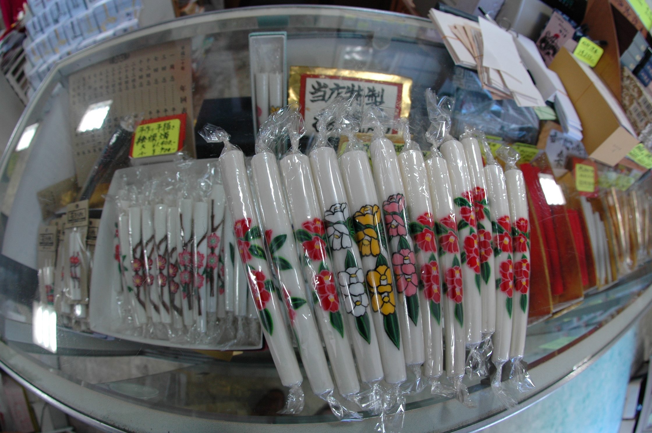 (先祖を思う心、残していきたい日本の伝統文化、手作りロウソク職人の店) 昔は、冬の間、仏壇に供える花が少なくロウソクに花の絵を書いて供えていた文化